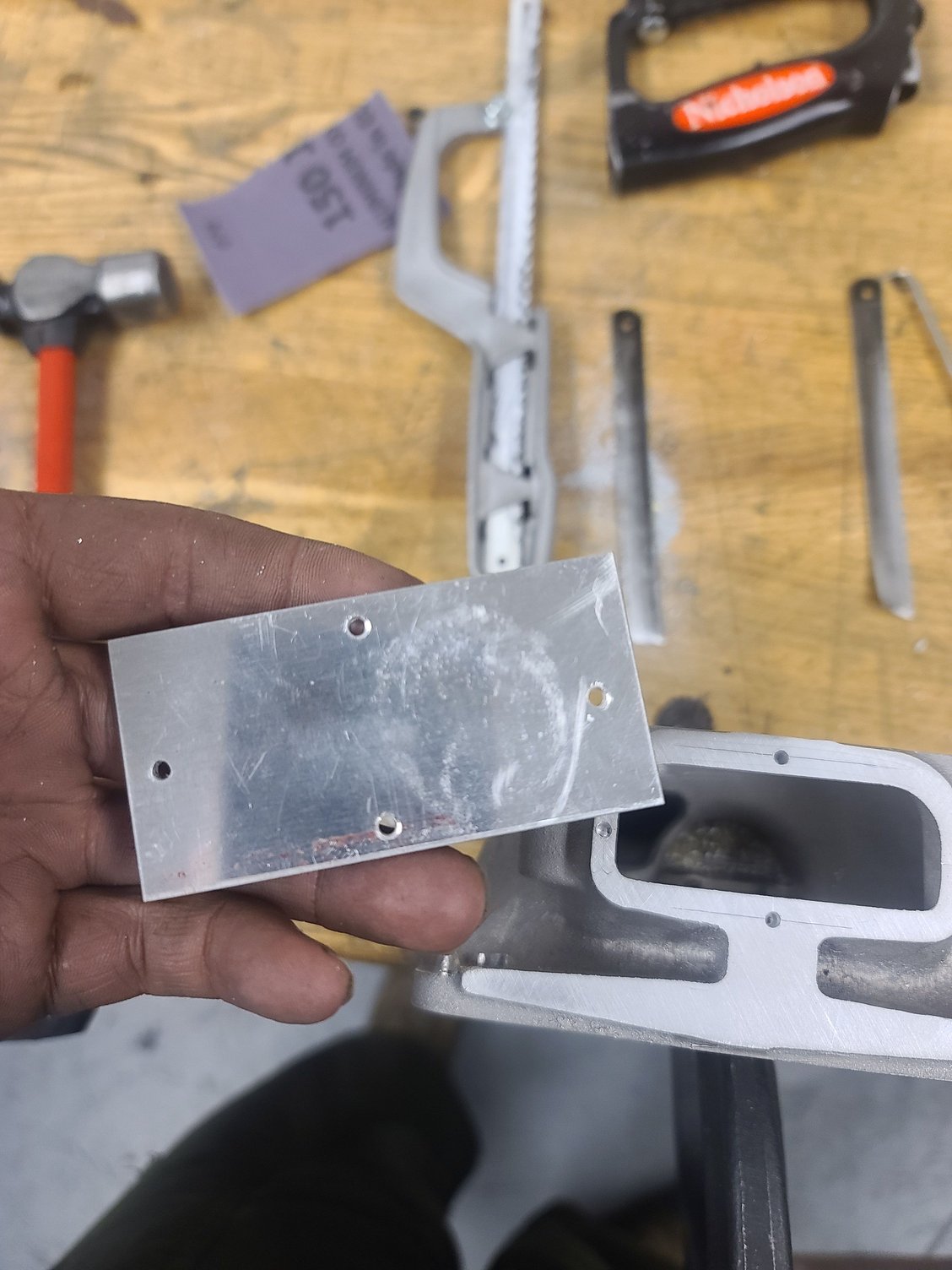 I couldnt find a shop to cut the throttle body mount for me, so I did it myself with a hacksaw and some sand paper. Measure 1.25 from the bottom up and make a cut with your prefered meathod. Then, glue or clamp some p50 paper down and lap it flat. Then use p150. You should be left with a machine flat surface. Now i was going to bolt my plate to it, but decided using EA9394 adhesive would be better. You can bolt it down if you want. But this saved me time and having to use a gasket. This will make clearance for the blower and the valley cover. Before cut After cut Raw cut surface Lapped surface with drilled holes 6061-T6 .100" thick plate. 1.5"W x 3"L LOCTITE EA9394 Applied Solid bead all the way around