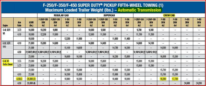 My family is looking to buy an F350 to tow a large 5th wheel. Looking at the Ford 2009 RV trailer and towing guide the truck I want is an F350 Diesel with a 4.30LS axel ratio. (see picture)
