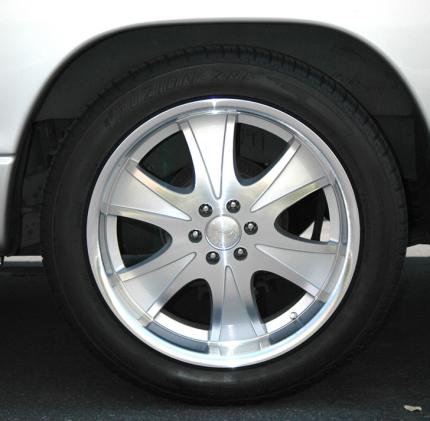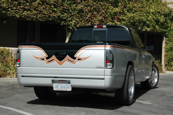 Exterior: Custom two-tone House of Kolor paint job by renowned car painter Steve Vandemon, Sport suspension kit by Ground Force, K&N FIPK intake, Flowmaster 3" Catback exhaust system, Linex bedliner, Cervinis SS Hood with custom pinstriping, Sir Michaels steel roll pan, Street Scene dual signal mirrors, Option Racing diamond mesh grille, Black Rhino 20" wheels, Angel Eye halo headlights, Stylin' Trucks LED tail lights